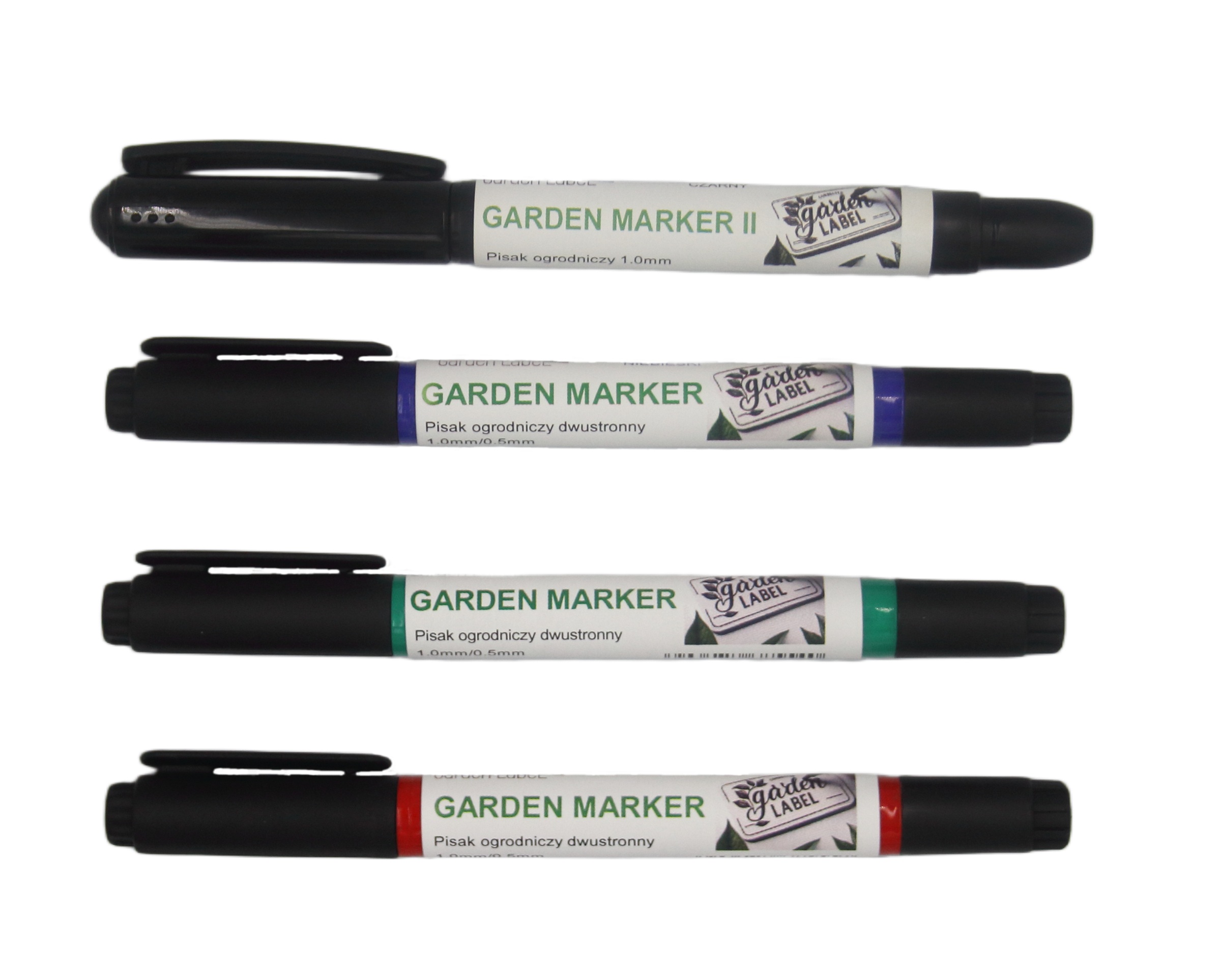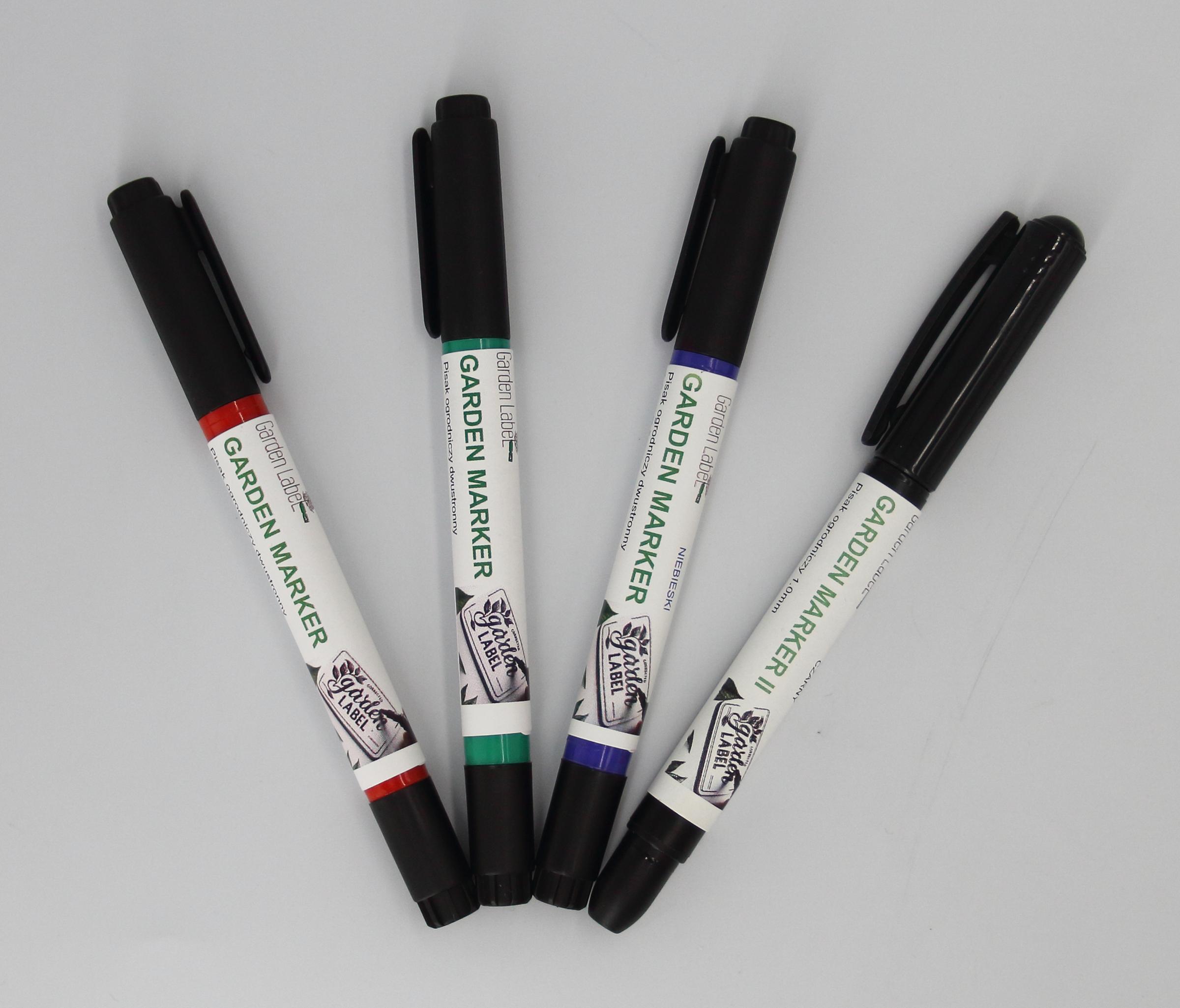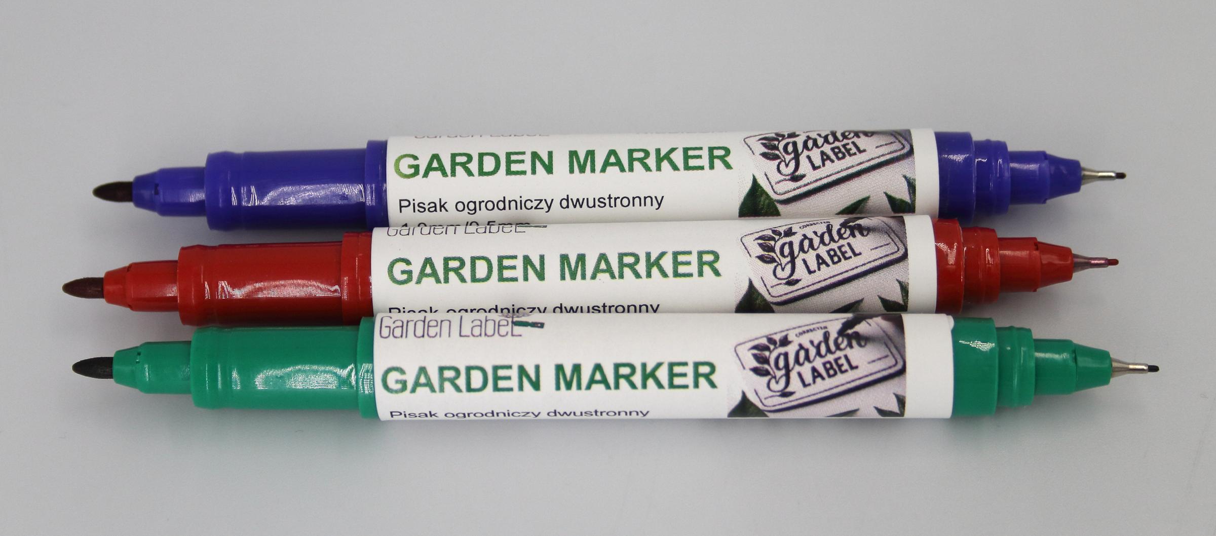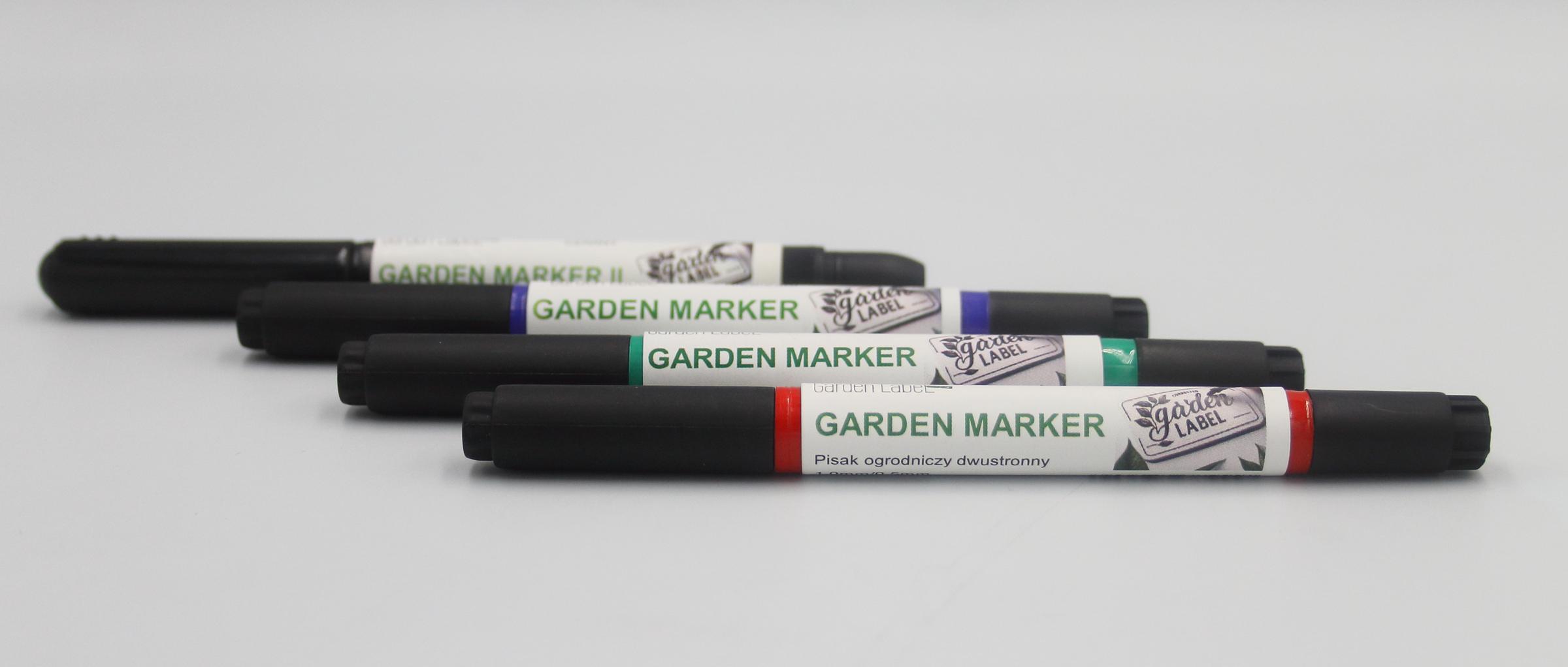 Markery ogrodnicze (zielony, niebieski, czerwony) posiadają dwie końcówki: okrągłą fibrową o grubości linii 1,0 mm oraz metalową igłową o grubości 0,5 mm, co pozwala na precyzyjne i czytelne oznaczanie roślin. Natomiast Marker Czarny posiada jedną końcówkę okrągłą fibrową o grubości 1,0mm.